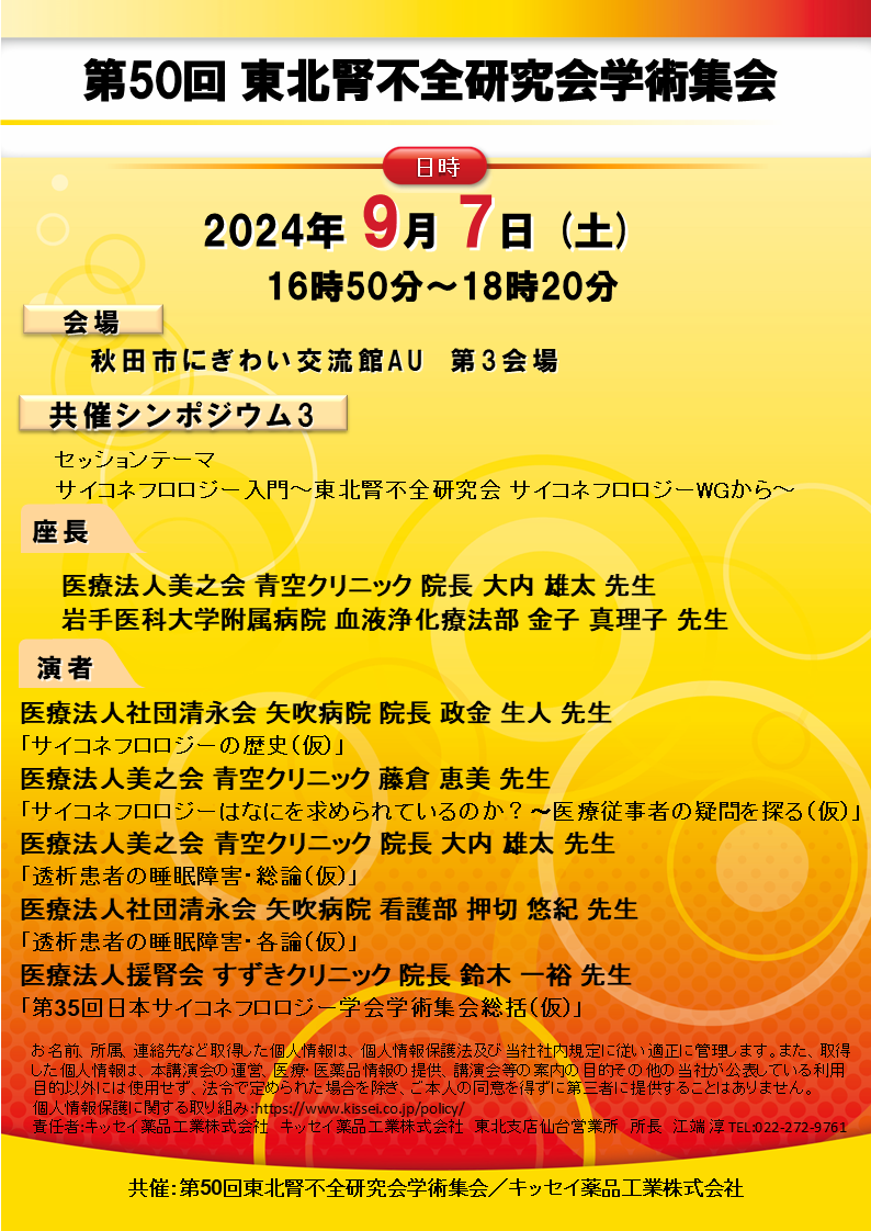 2023年、東北腎不全研究会サイコネフロロジーWGが発足され、2024年9月7日~8日に開催されます第50回東北腎不全研究会で、下記のシンポジウムを開催することとなりました。